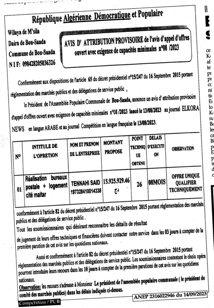 Avis d’attribution provisoire de l’avis d’appel d’offres ouvert N°08/2023 Commune de Bou Saada