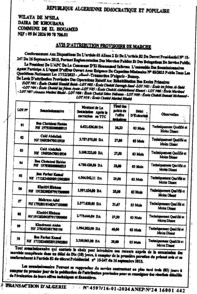 Avis d’attribution provisoire de marche/ Commune de El Houamed