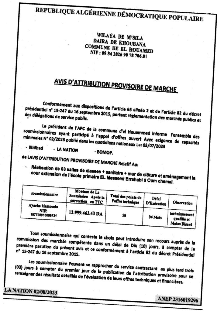 Avis d’attribution provisoire de marche/ Commune de El Houamed