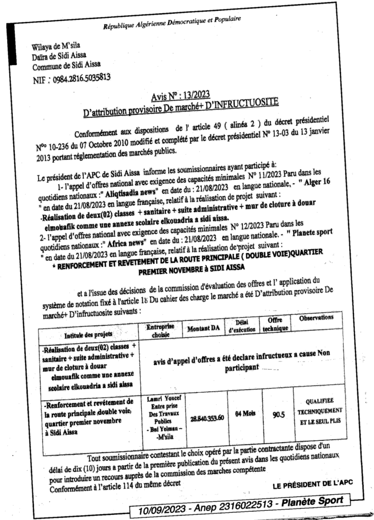 Avis d’attribution provisoire de marche + d’infructuosite N°13/2023 Commune de Sidi Aissa