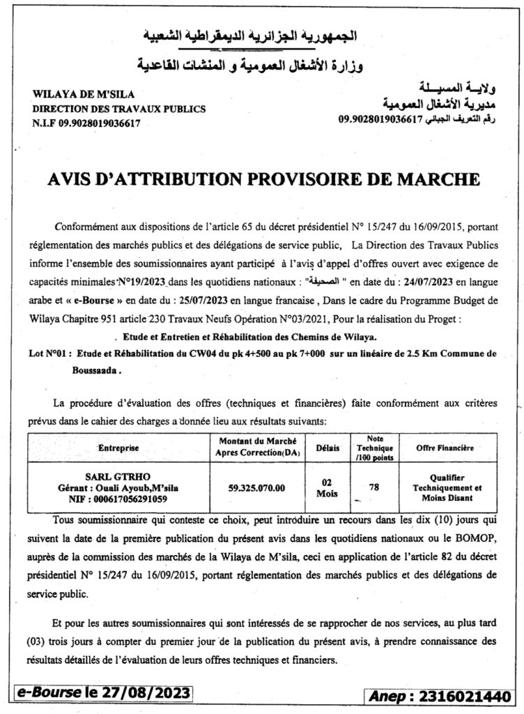 Avis d’attribution provisoire de marche/ Direction des travaux publics