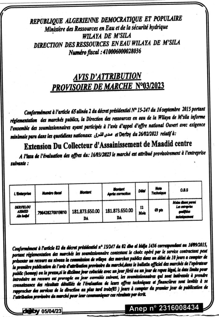 Avis d’Attribution Provisoire de Marche N°03/2023 Direction des Ressources en Eau Wilaya de M’sila