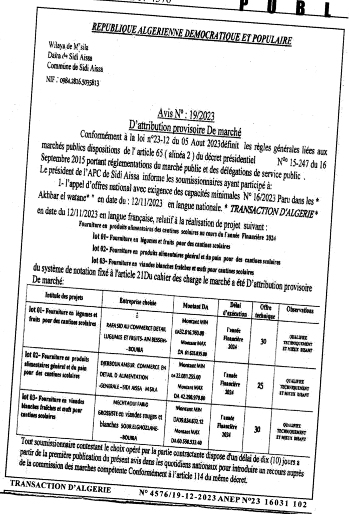 Avis d’attribution provisoire de marché N°10/2023 Commune de sidi aissa