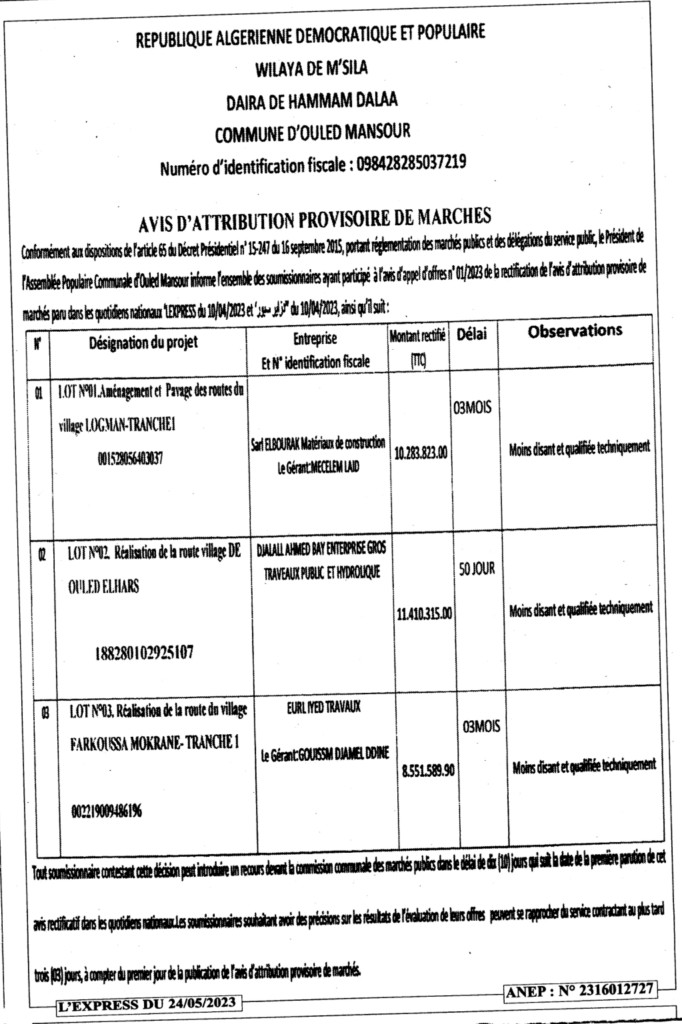 Avis d’attribution Provisoire de Marches/ Commune d’Ouled Mansour