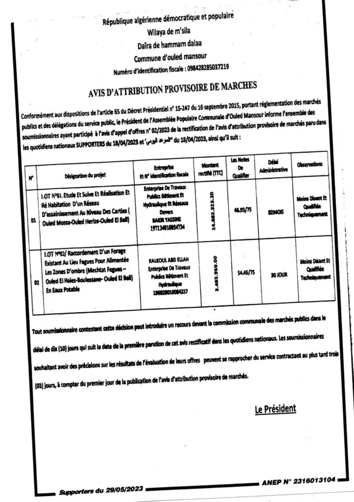 Avis d’attribution provisoire de marches/ Commune Ouled Mansour