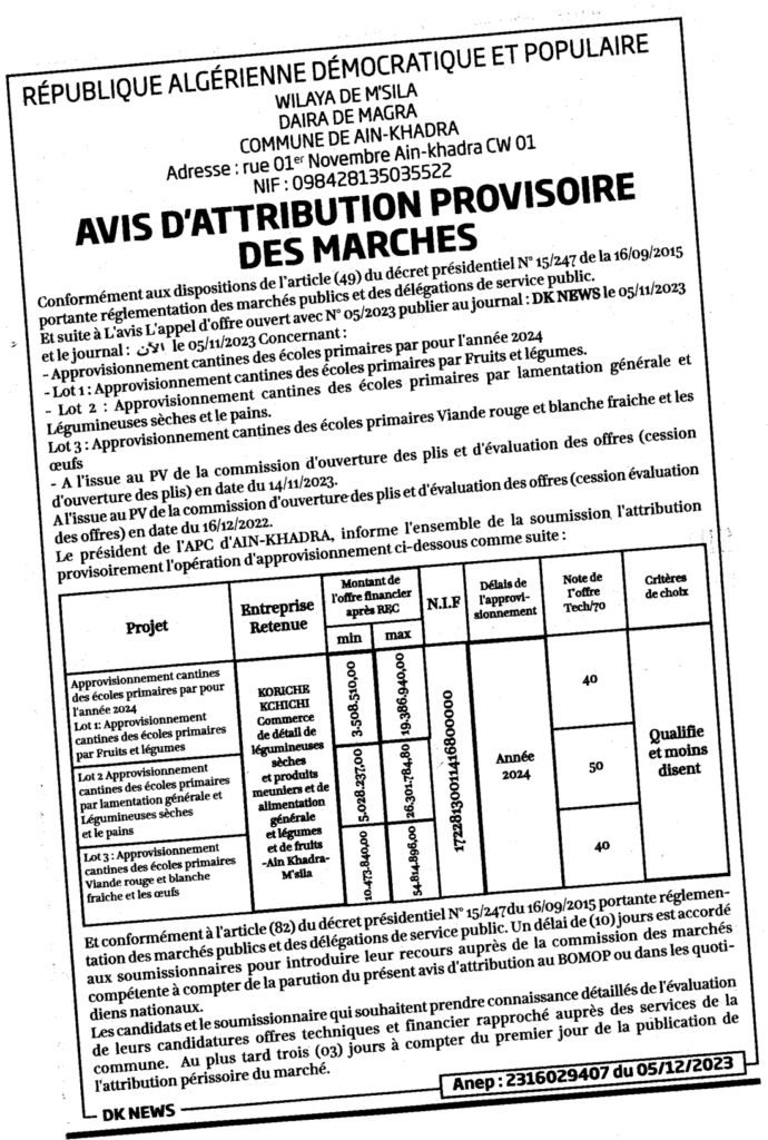 Avis d’attribution provisoire des marches/ Commune de Ain khadra