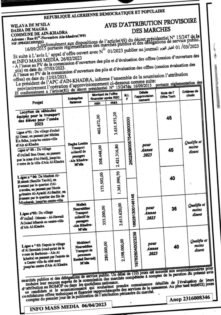 Avis d’Attribution Provisoire des Marches/ Commune de Ain-khadra