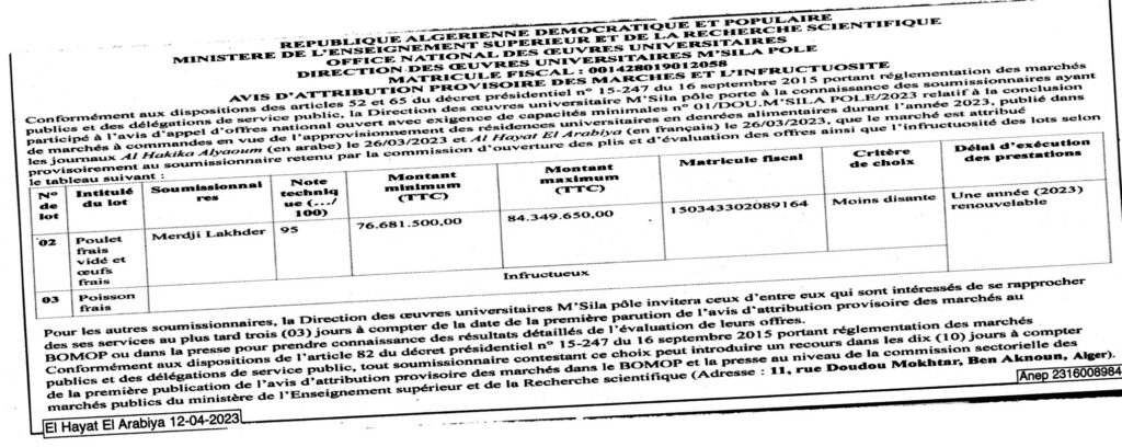Avis d’Attribution Provisoire des Marches et l’Infructuosite/ Direction des Œuvres Universitaires M’sila Pole