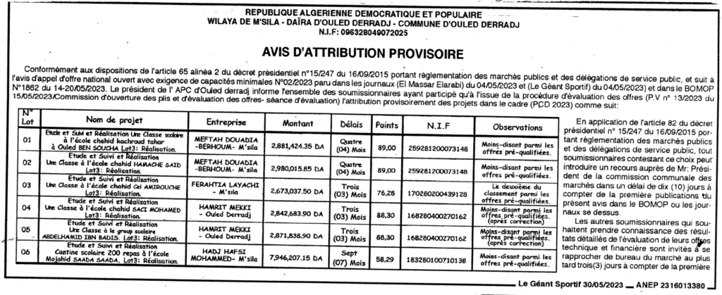 Avis d’Attribution Provisoire des Projet dans le cadre (PCD 2023)/ Commune d’Ouled Derradj