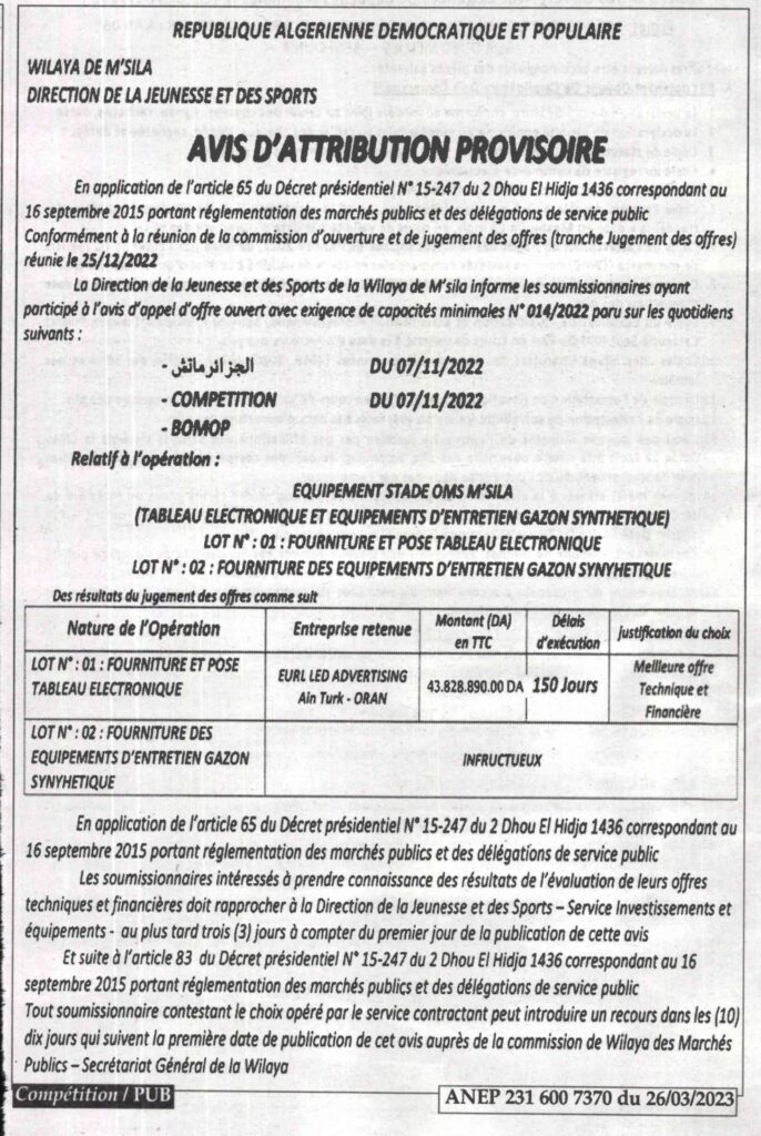Avis d’Attribution Provisoire/ Direction de la Jeunesse et des Sports