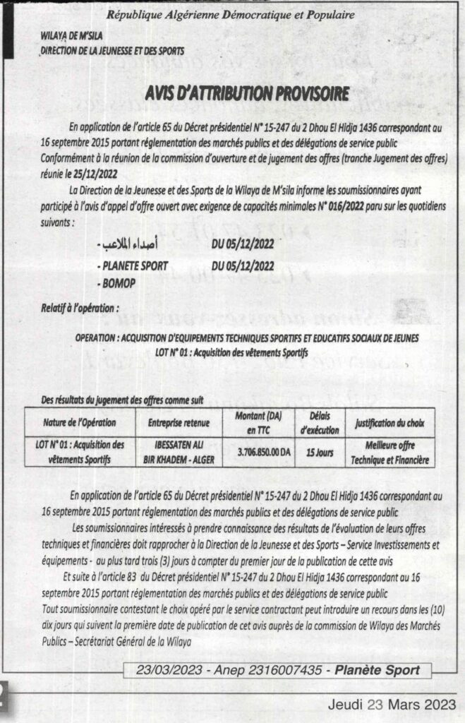 Avis d’Attribution Provisoire/ Direction de la Jeunesse et des Sports