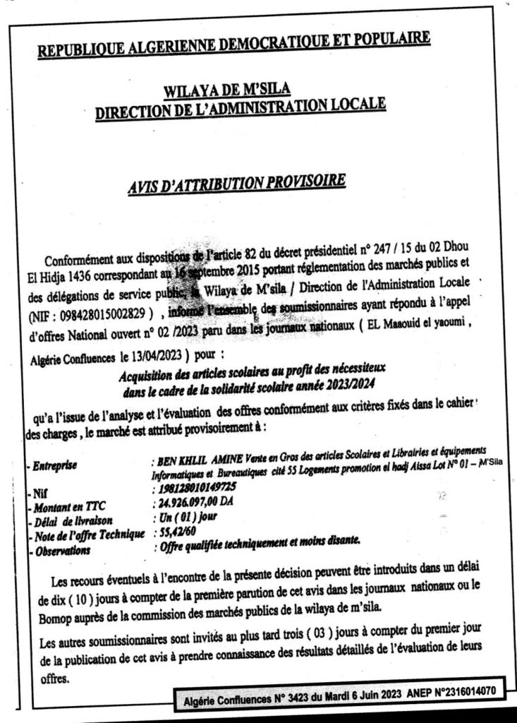 Avis d’attribution provisoire Direction de l’administration locale de wilaya de M’sila
