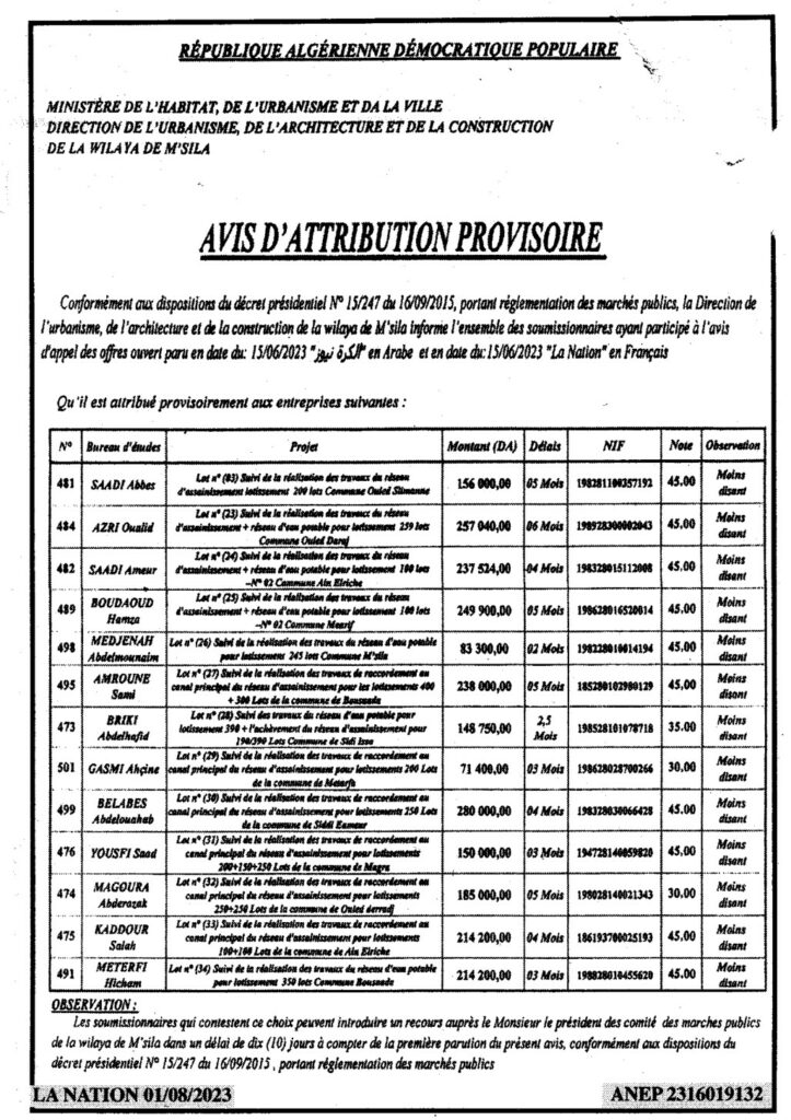 Avis d’attribution provisoire/ Direction de l’urbanisme de la l’architecture et de la construction de la wilaya de M’sila
