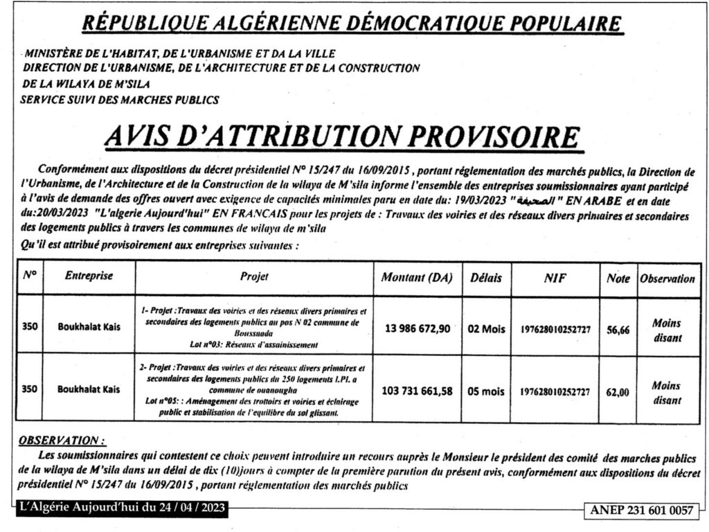 Avis d’attribution provisoire/ Direction de l’urbanisme, de l’architecture et de la construction