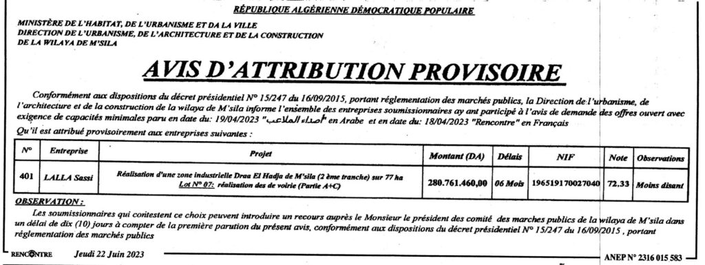 Avis d’attribution provisoire/ Direction de l’urbanisme de l’architecture et de la construction de la wilaya de M’sila