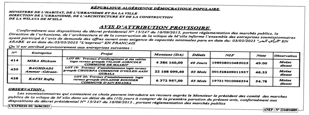 Avis d’attribution provisoire/ Direction de l’urbanisme de l’architecture et de la construction de la wilaya de M’sila