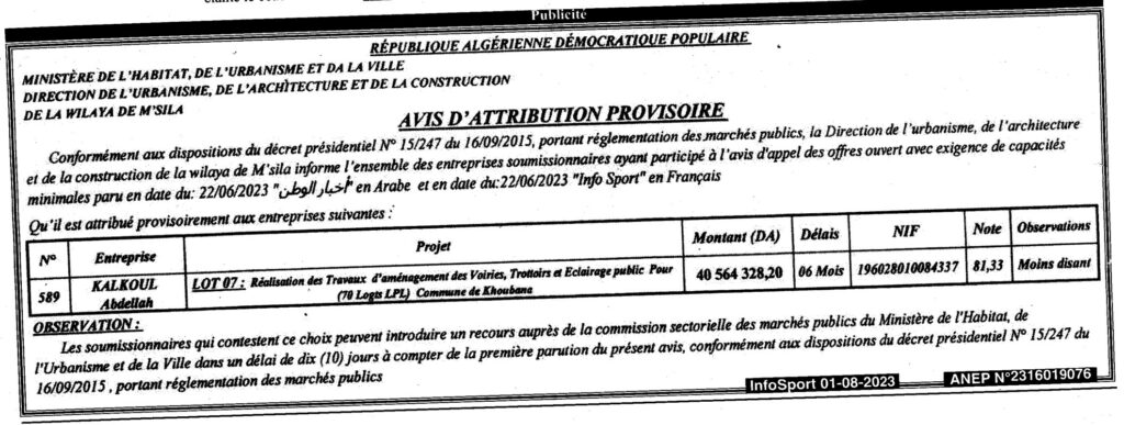 Avis d’attribution provisoire/ Direction de l’urbanisme de l’architecture et de la construction de la wilaya de M’sila