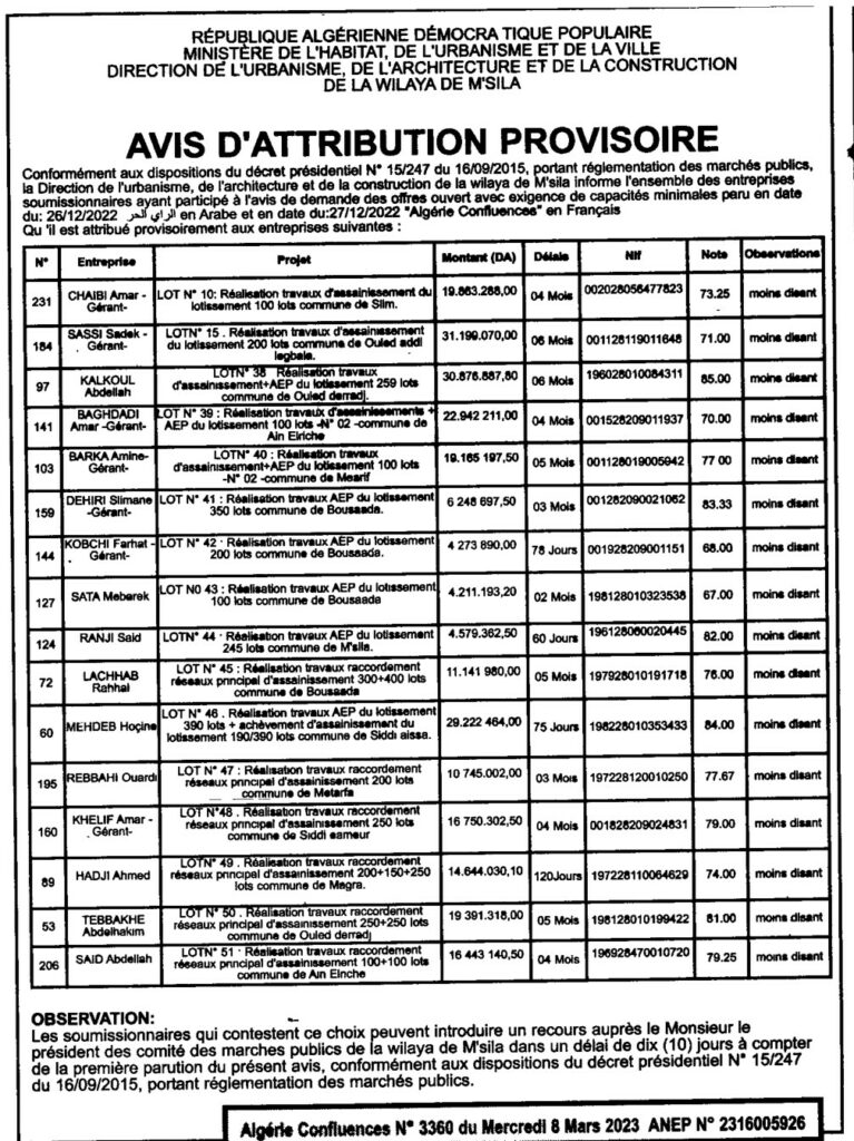 Avis d’Attribution Provisoire/ Direction de L’urbanisme de L’Architecture et de la Construction de la Wilaya de M’sila