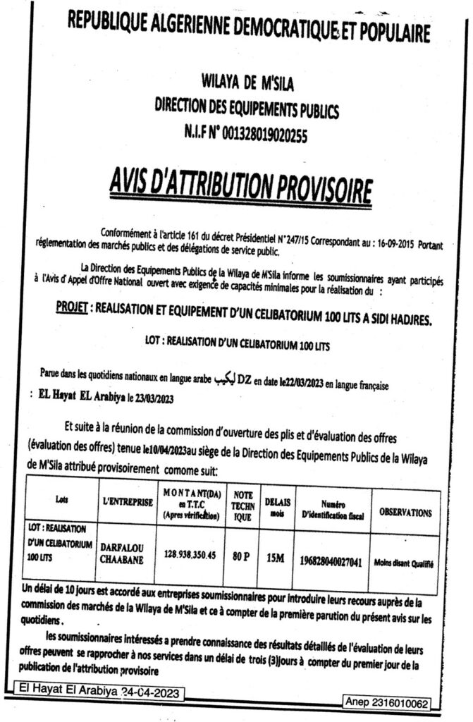 Avis d’Attribution Provisoire/ Direction des Équipement Publics Wilaya de M’sila