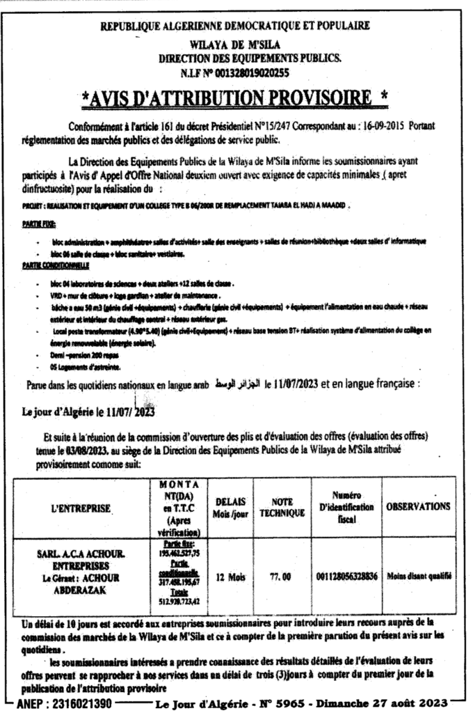 Avis d’attribution provisoire/Direction des équipements publics