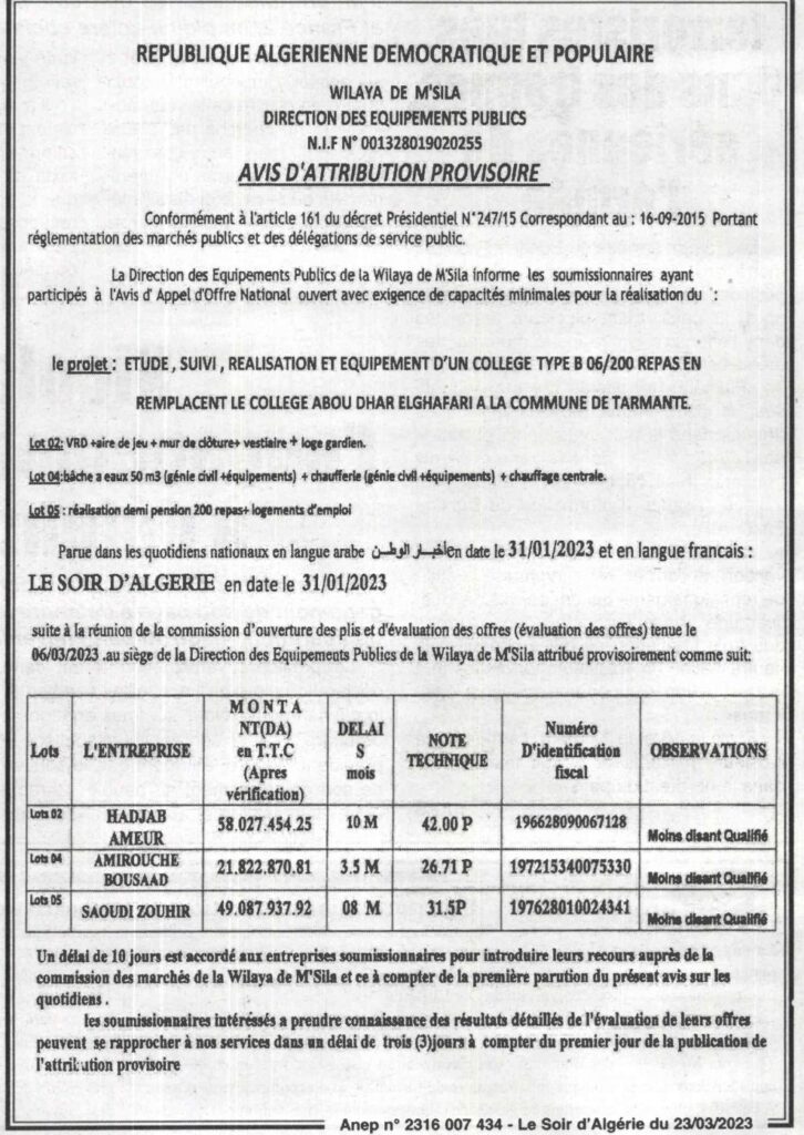 Avis d’Attribution Provisoire/ Direction Des Equipements Publics wilaya de M’sila