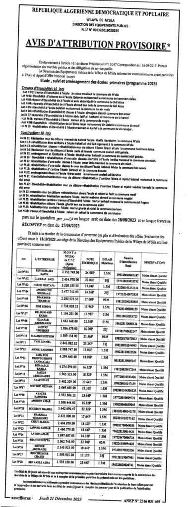 Avis d’attribution provisoire/ Direction des équipements publics Wilaya de M’sila