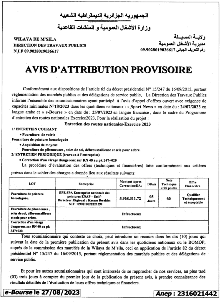Avis d’attribution provisoire/ Direction des travaux publics wilaya de M’sila