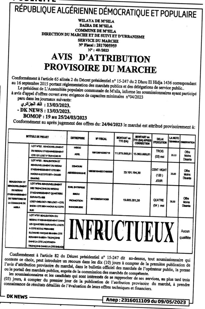 Avis d’Attribution Provisoire du Marche 40/2023 Commune de M’sila