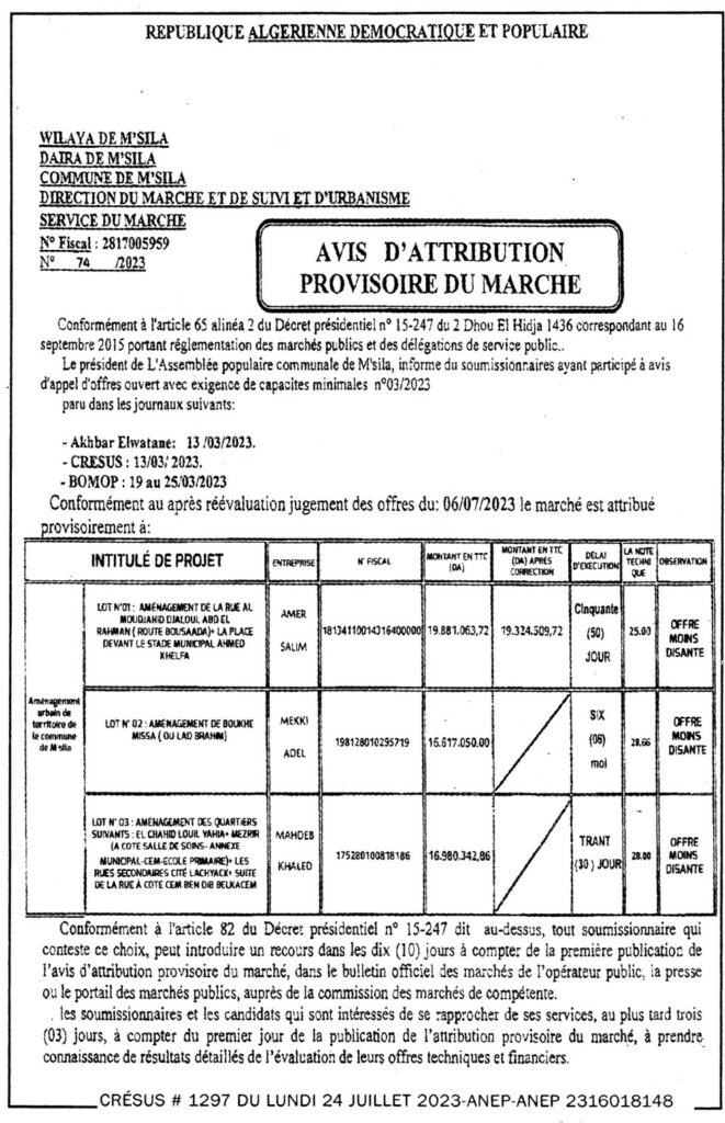 Avis d’attribution provisoire du marche/ Commune de M’sila