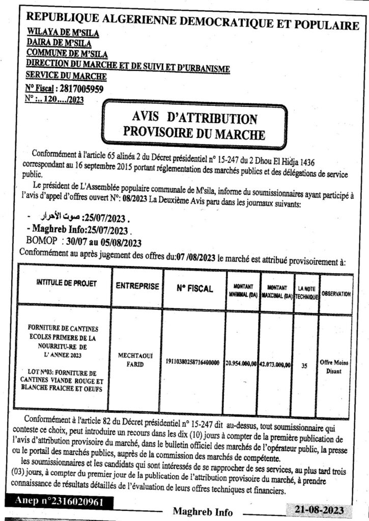 Avis d’attribution provisoire du marche/ Commune de M’sila