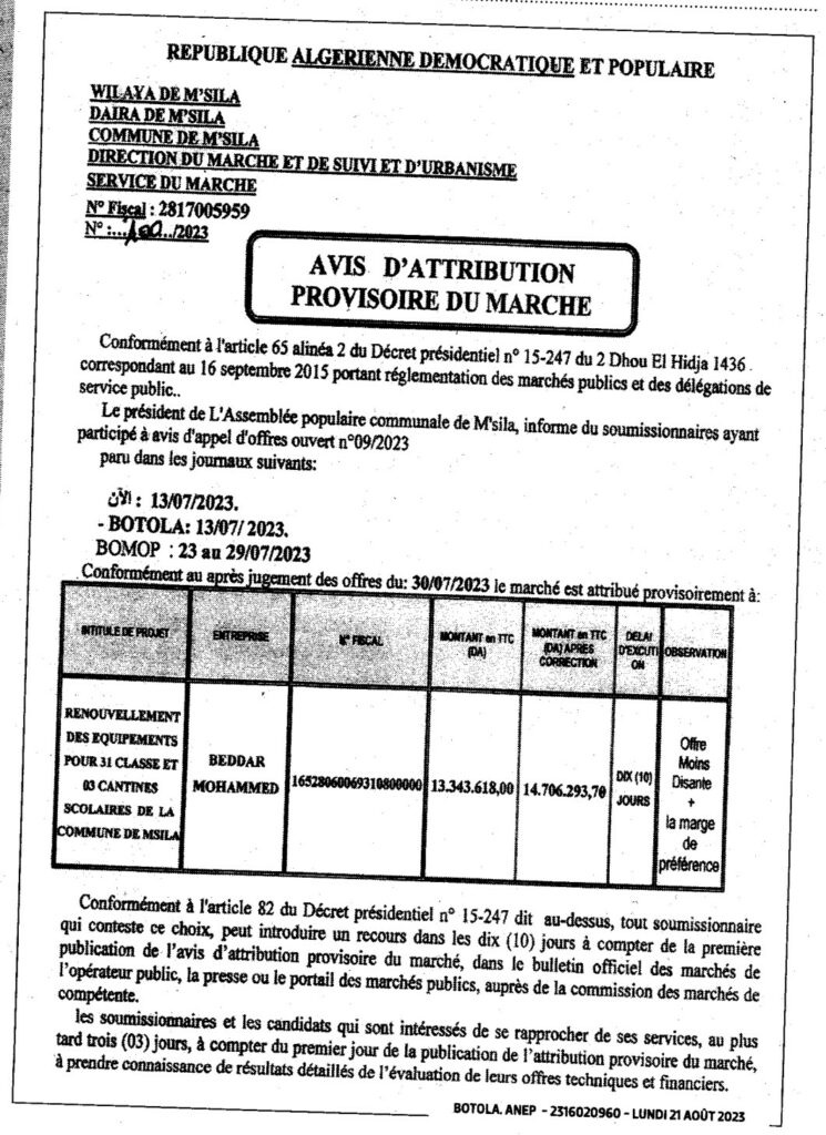Avis d’attribution provisoire du marche/ Commune de M’sila