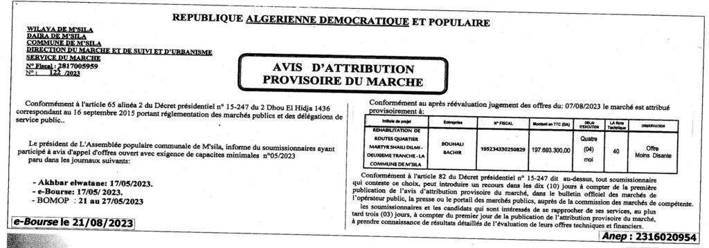 Avis d’attribution provisoire du marche/ Commune de M’sila