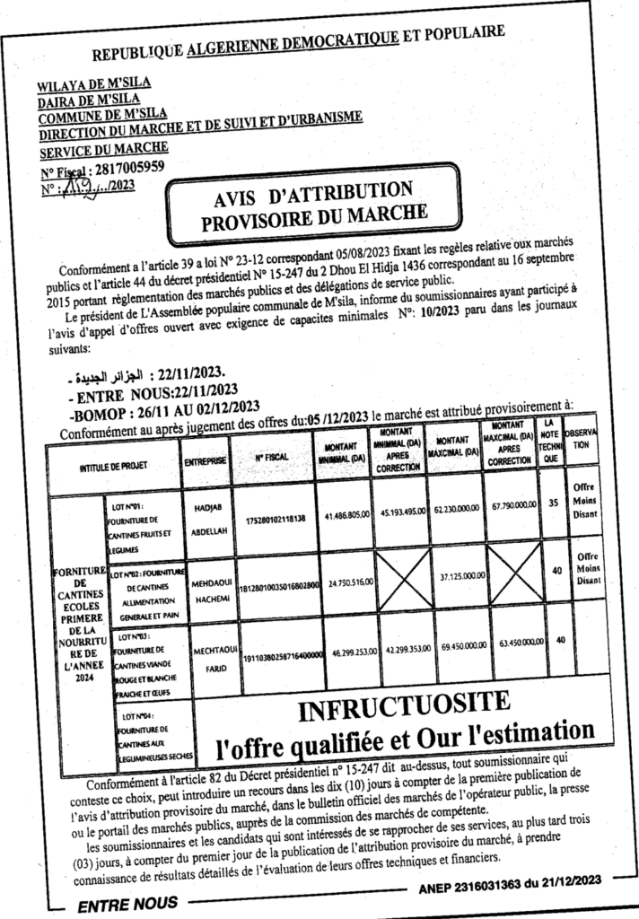 Avis d’attribution provisoire du marche/ Commune de M’sila
