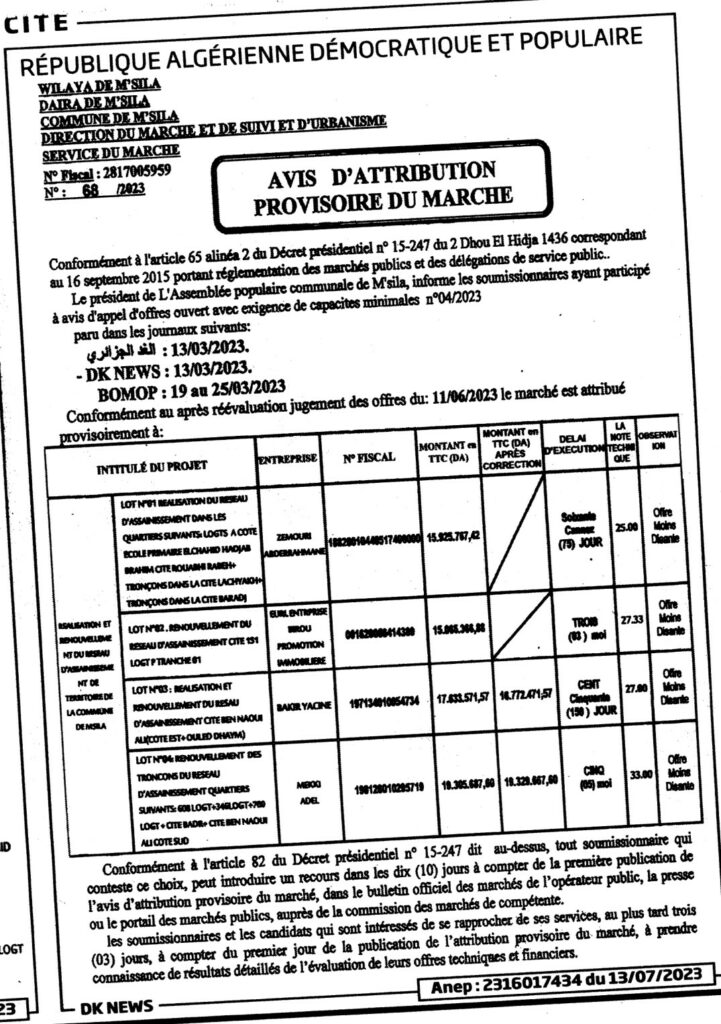 Avis d’attribution provisoire du marche/ Commune de M’sila