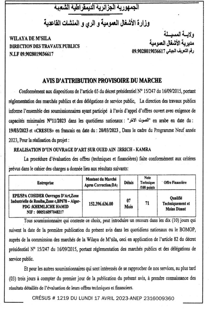 Avis d’Attribution Provisoire du Marche/ Direction des Travaux Publics wilaya de M’sila