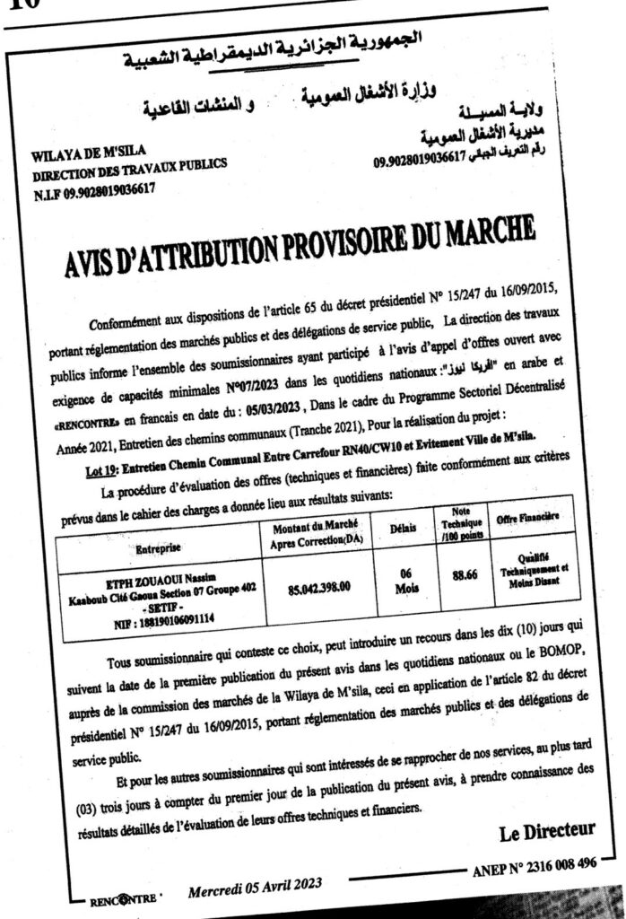 Avis d’Attribution Provisoire du Marche/ Direction des Travaux Publics