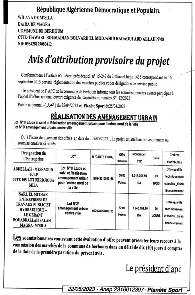 Avis d’attribution Provisoire du Projet: Réalisation des aménagement Urbain Commune de Berhoum
