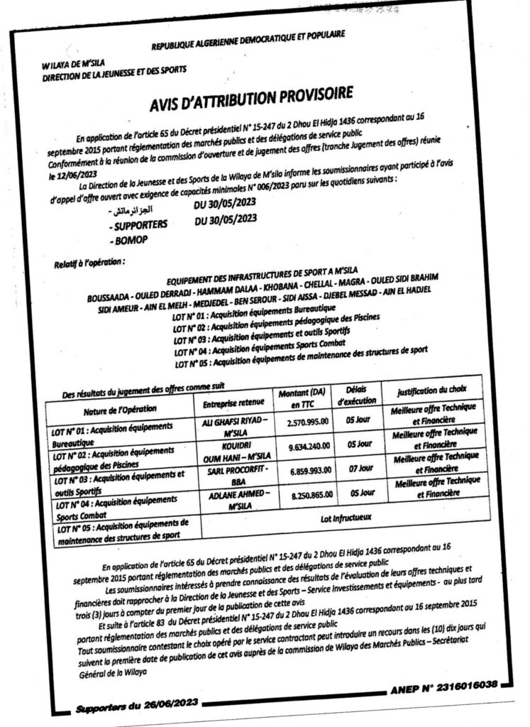 Avis d’attribution provisoire: Équipement des infrastructures de sport à M’sila/ Direction de la jeunesse et des sports