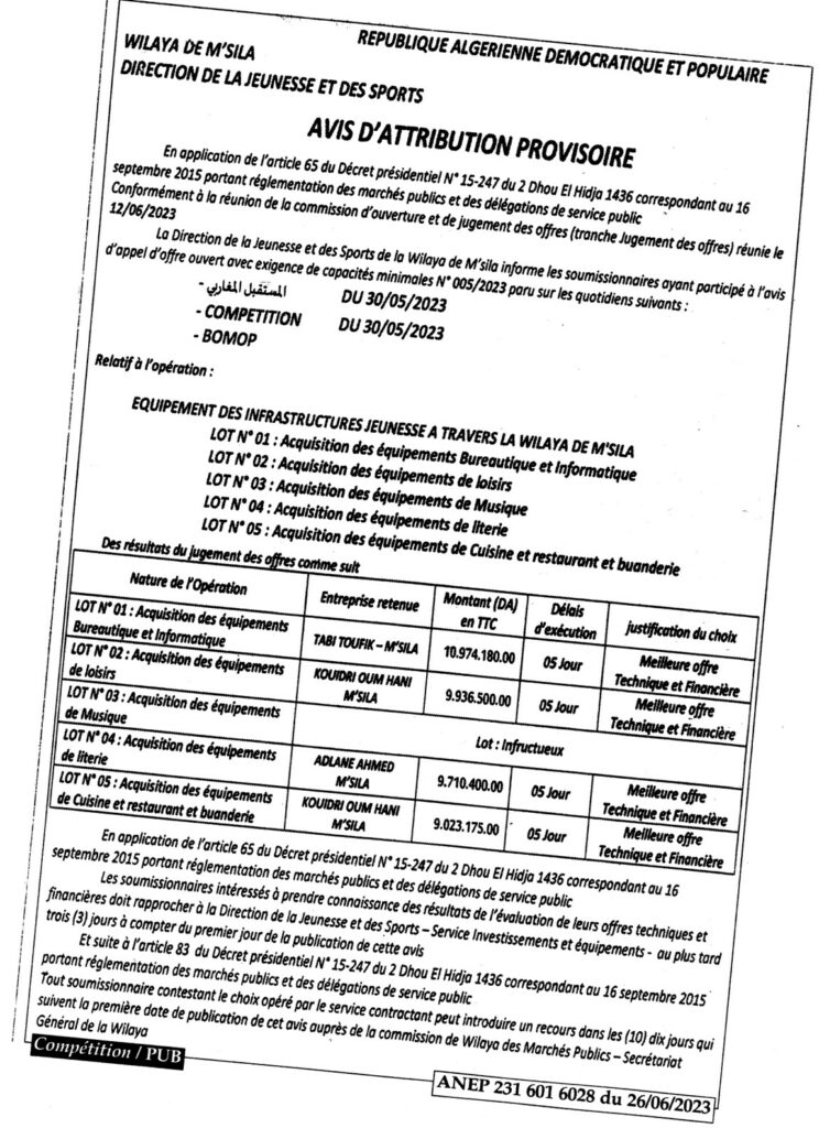 Avis d’attribution provisoire: Équipement des infrastructures jeunesse à travers la wilaya de M’sila/ Direction de la jeunesse et des sports