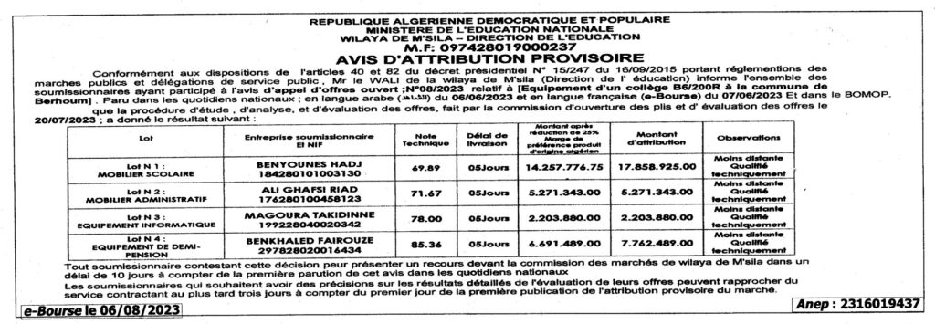 Avis d’attribution provisoire: Equipement d’un collége B6/200R à la commune de berhoum/ Direction de l’education wilaya de M’sila