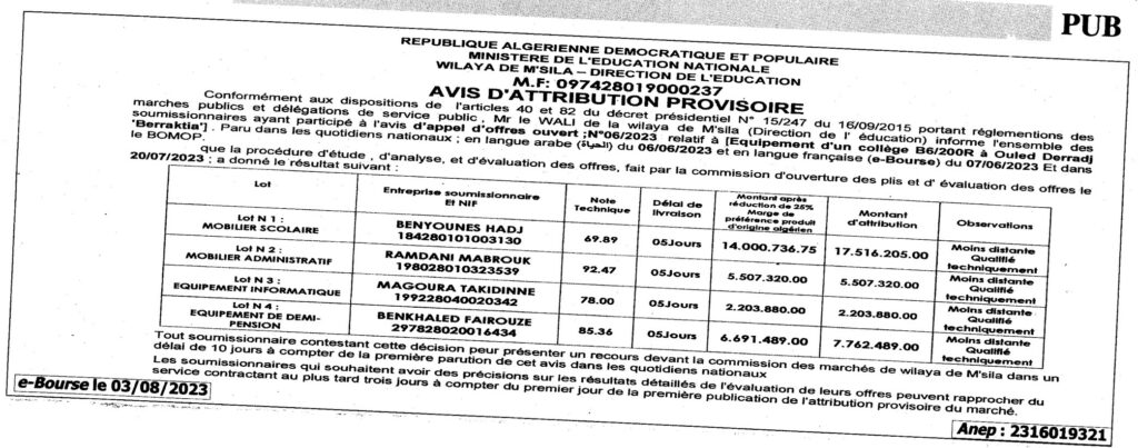Avis d’attribution provisoire: Equipement d’un collége B6/200r à ouled derradj ‘braktia’ Direction de l’education de la wilaya de M’sila
