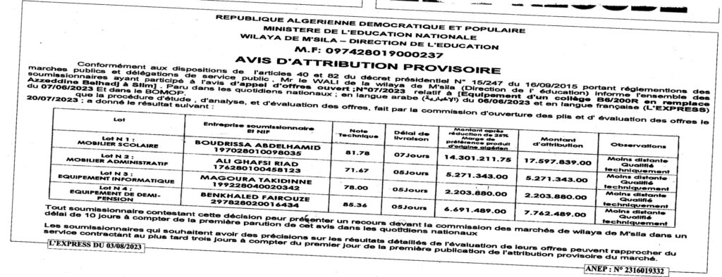 Avis d’attribution provisoire: equipement d’un collége B6/200R en remplace azzeddine belhadj à slim Direction de l’education