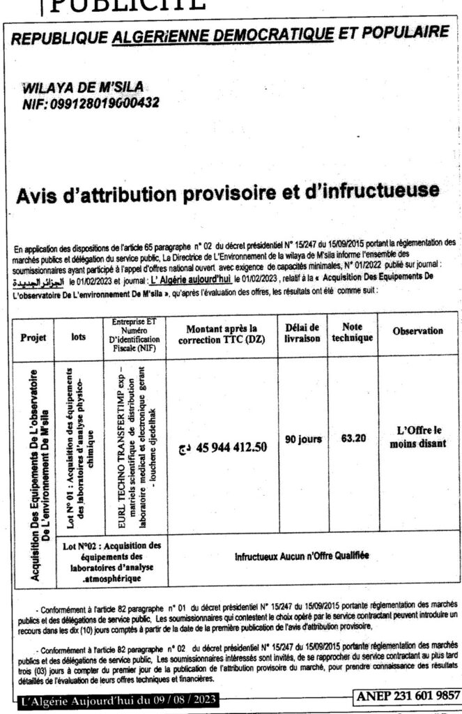 Avis d’attribution provisoire et d’infructueuse/ Direction de l’environnement de la wilaya de M’sila
