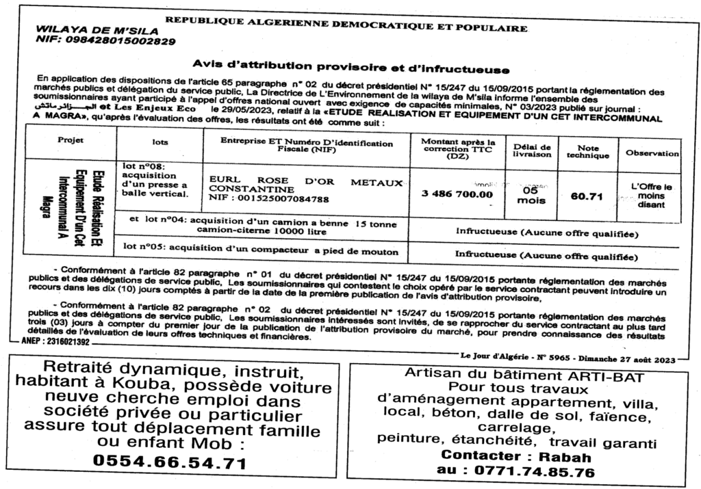 Avis d’attribution provisoire et infructueuse/ Direction de l’environnement de la wilaya de M’sila