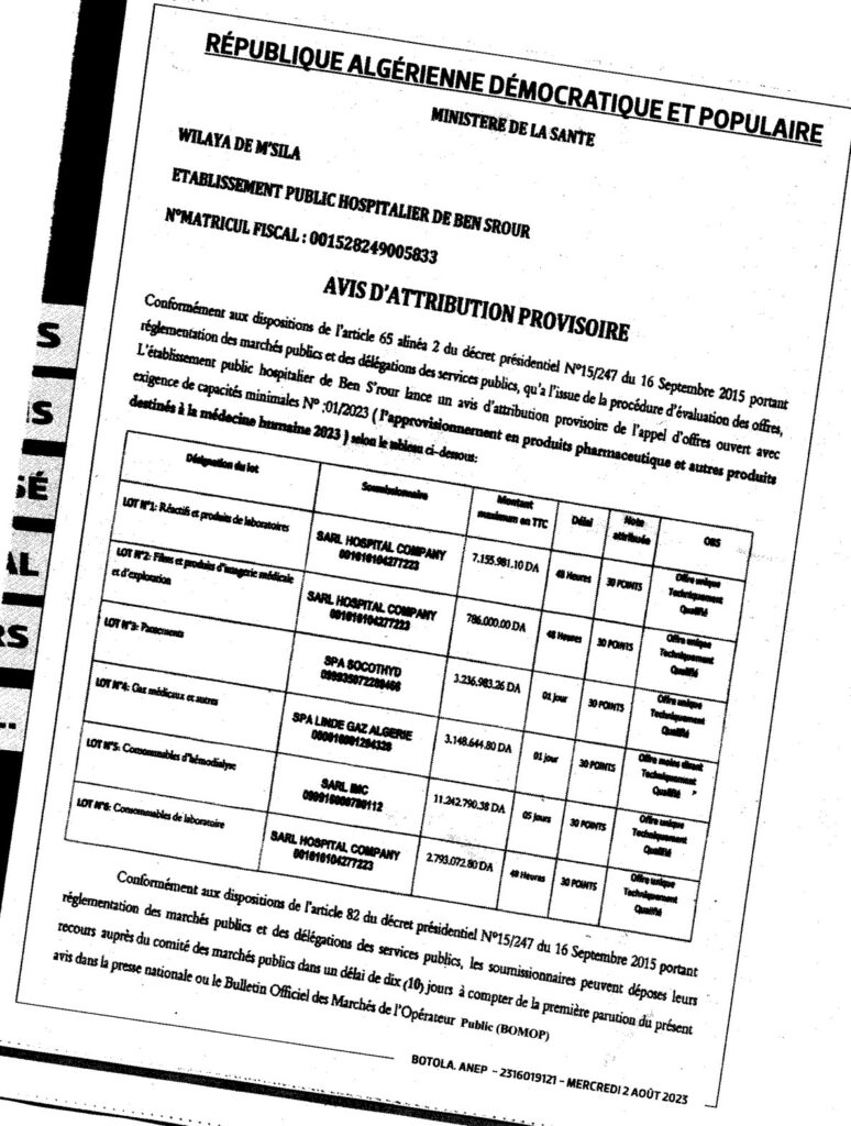 Avis d’attribution provisoire/ Etablissement public hospitalier de Ben-Srour