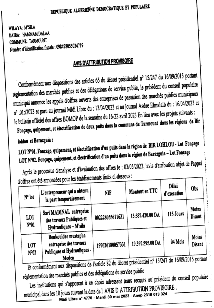 Avis d’attribution provisoire: Fonçage, équipement, et électrification de deux puits dans la commune de tarmount dans les régions de Bir lohlou et Barazguia