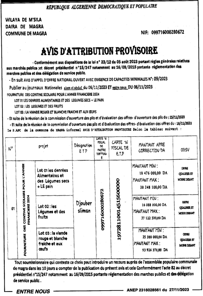 Avis d’attribution provisoire: Fourniture des contins scolaire pour l’année financière 2024/ Commune de Magra