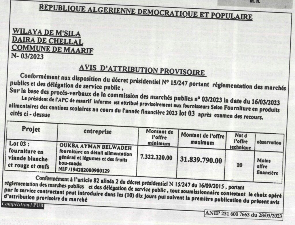 Avis d’Attribution Provisoire N°03/2023 Commune de Maarif