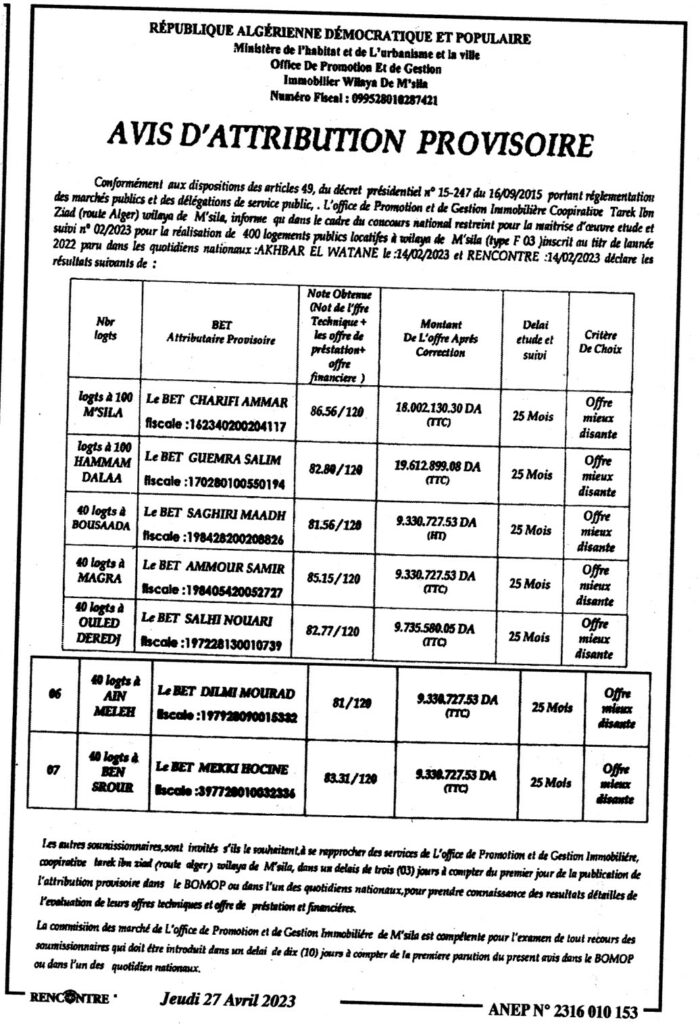 Avis d’Attribution Provisoire N°03/2023 pour la réalisation de 400 logements publics locatifs à wilaya de M’sila/ Office de Promotion et de Gestion