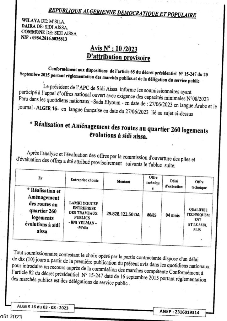 Avis d’attribution provisoire N°10/2023 Commune de Sidi Aissa